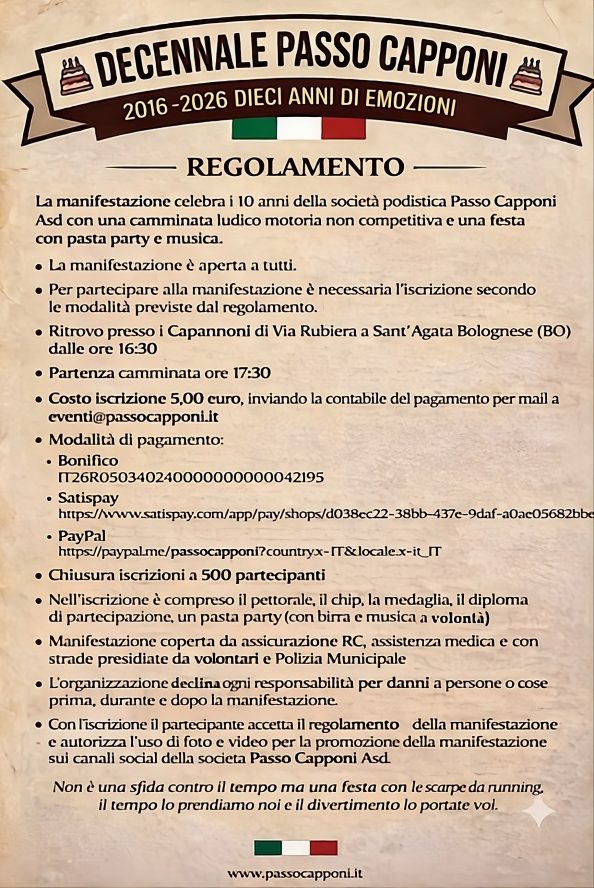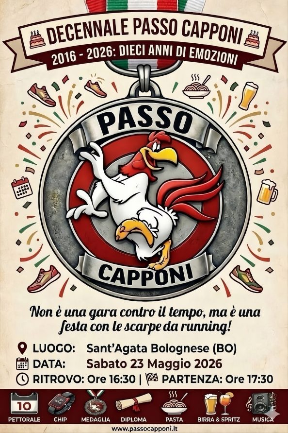 Ciao a tutti, finalmente ci siamo!!! Vi invitiamo ufficialmente alla festa del decennale del Passo Capponi che si terrà sabato 23 Maggio 2026 a Sant’Agata Bolognese (BO) Ecco il programma : Ritrovo presso i Capannoni di Via Rubiera a S.Agata Bolognese (BO) dalle ore 16;30 Partenza corsa (non competitiva e aperta a tutti) ore 17:30 Percorso “on the track” da[…]