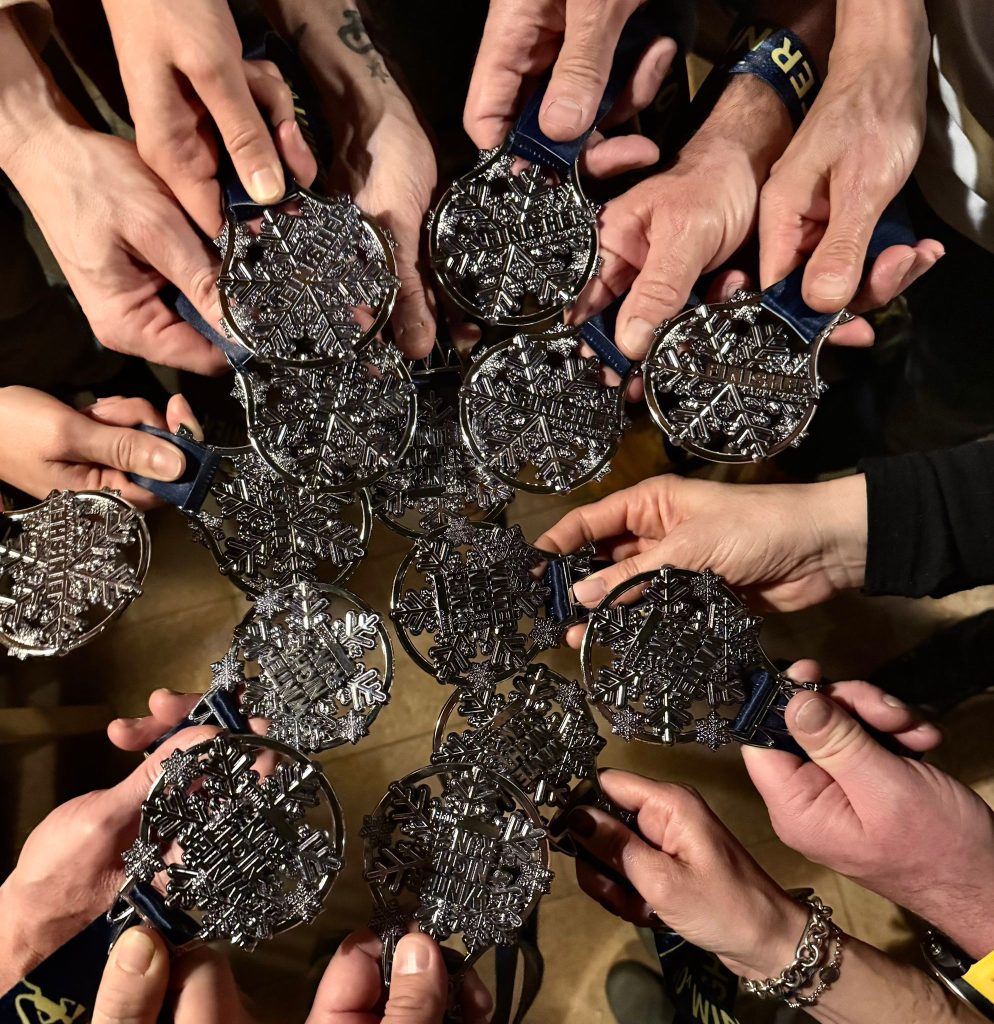 Nonostante avesse nevicato e quindi gli appoggi fossero difficili, i nostri eroici Capponi non si sono lasciati intimorire, ha prevalso la voglia di correre in un contesto unico al mondo, partendo belli carichi con la musica a palla della Nordic Arena per poi entrare nel silenzio affascinante all’interno della natura imbiancata dalla neve. La luce del giorno che pian piano si “spegne” rende ancora più magico e suggestivo il serpentone di mille e più luci frontali che in fila indiana si snoda sul percorso. Man mano che ci si avvicina all’arrivo si sente sempre più forte la musica della Nordic Arena e si inizia ad assaporare la medaglia, in questo luogo che tra pochi giorni sarà scenario dei Giochi olimpici invernali 2026.